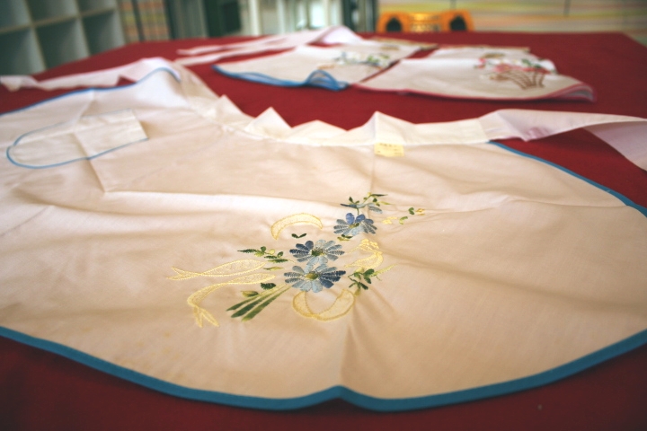 右:お花の刺繍のサロンエプロン。まだパッケージされたまま残ってました。